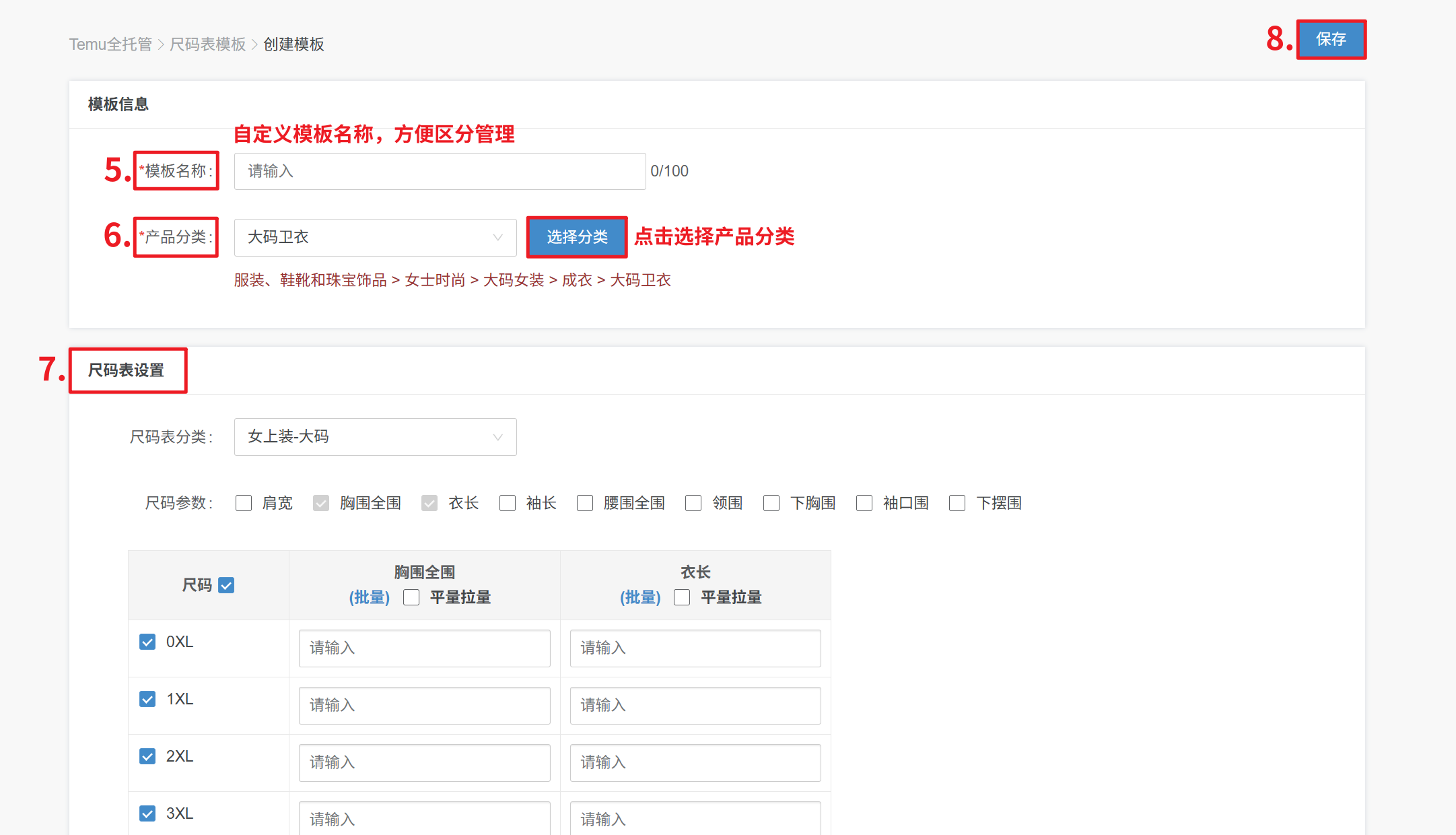 【产品—Temu全/半托管—常用模板—尺码表模板—创建模板—自定义填写模板名称—选择分类—添加尺码表信息—保存】