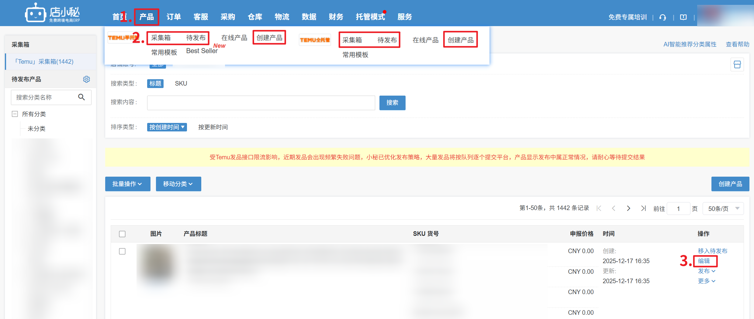 【产品—Temu全/半托管产品—采集箱/待发布/创建产品—点击编辑—添加尺码表—下拉选择引用模板—确定】