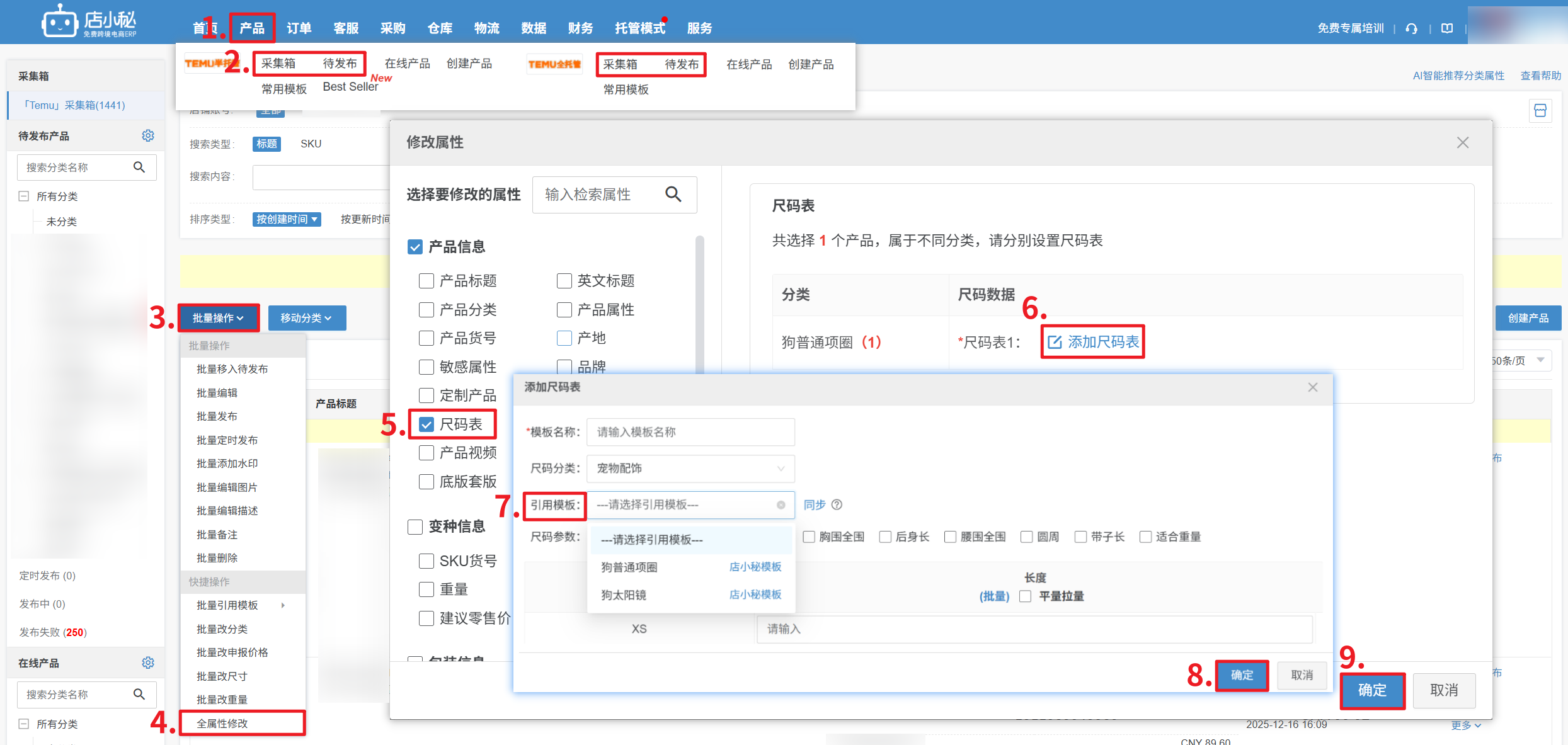 【产品—Temu全/半托管产品—采集箱/待发布状态—勾选产品—批量操作—全属性修改—尺码表—添加尺码表—下拉选择尺码表模板—确定】