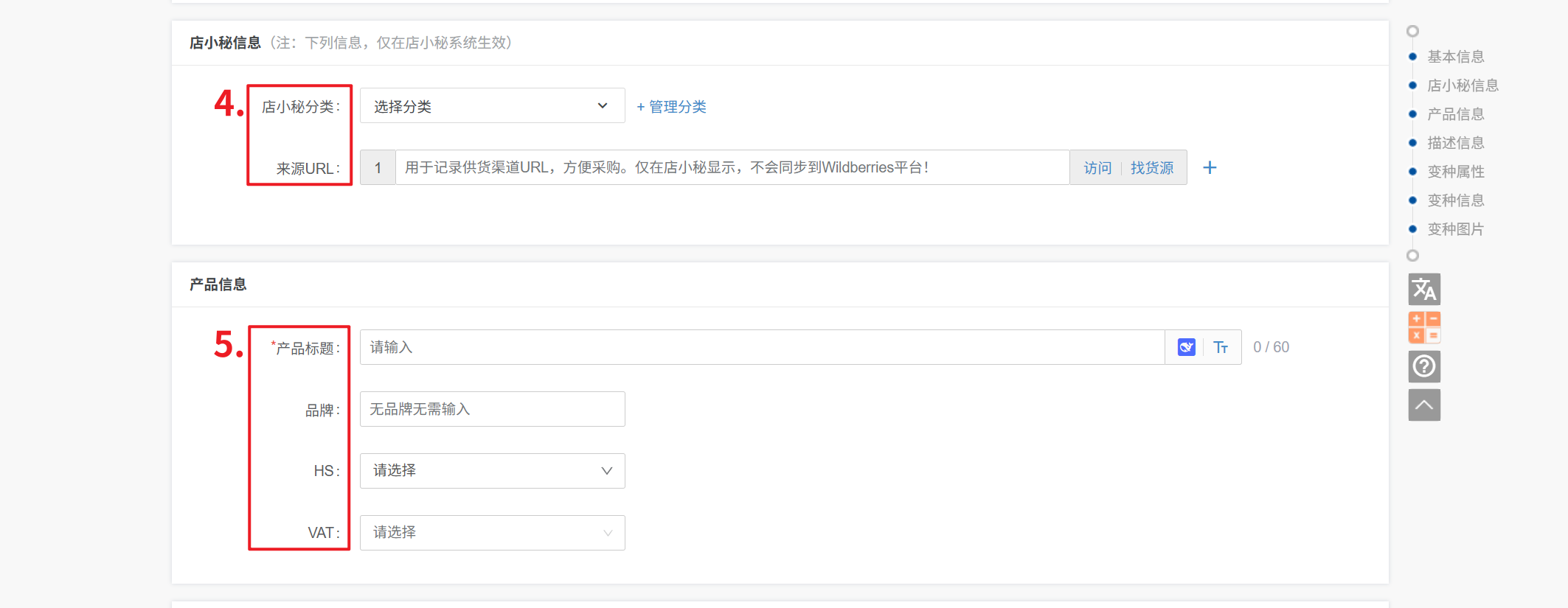 ③ HS:可在海关查询网址,查询产品对应的编码是哪个,填写后用于海关申报,部分类目无需设置 海关编码
