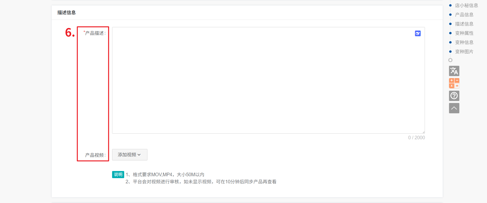 ② 产品视频:支持本地上传、网络上传,格式要求MOV,MP4,大小50M以内