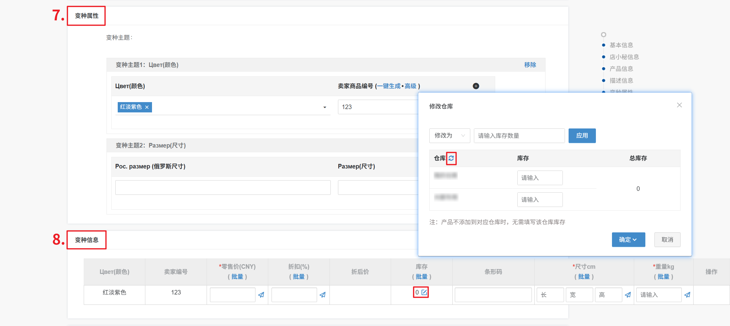 ③ 库存:点击批量/单个变种编辑操作,同步仓库,可针对不同仓库填写库存,若产品不添加到对应仓库,无需填写该仓库库存