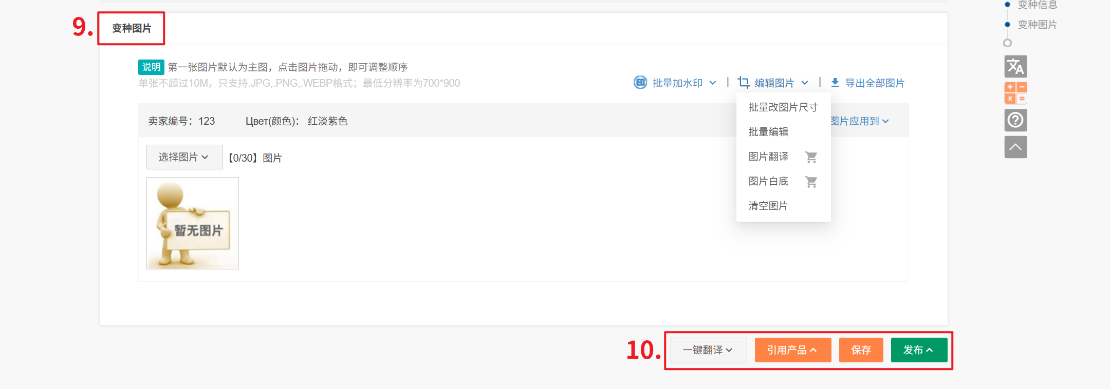 9、变种图片:1、每个变种可单独上传30张图片,单张不超过10M,只支持JPG、PNG、WEBP格式
