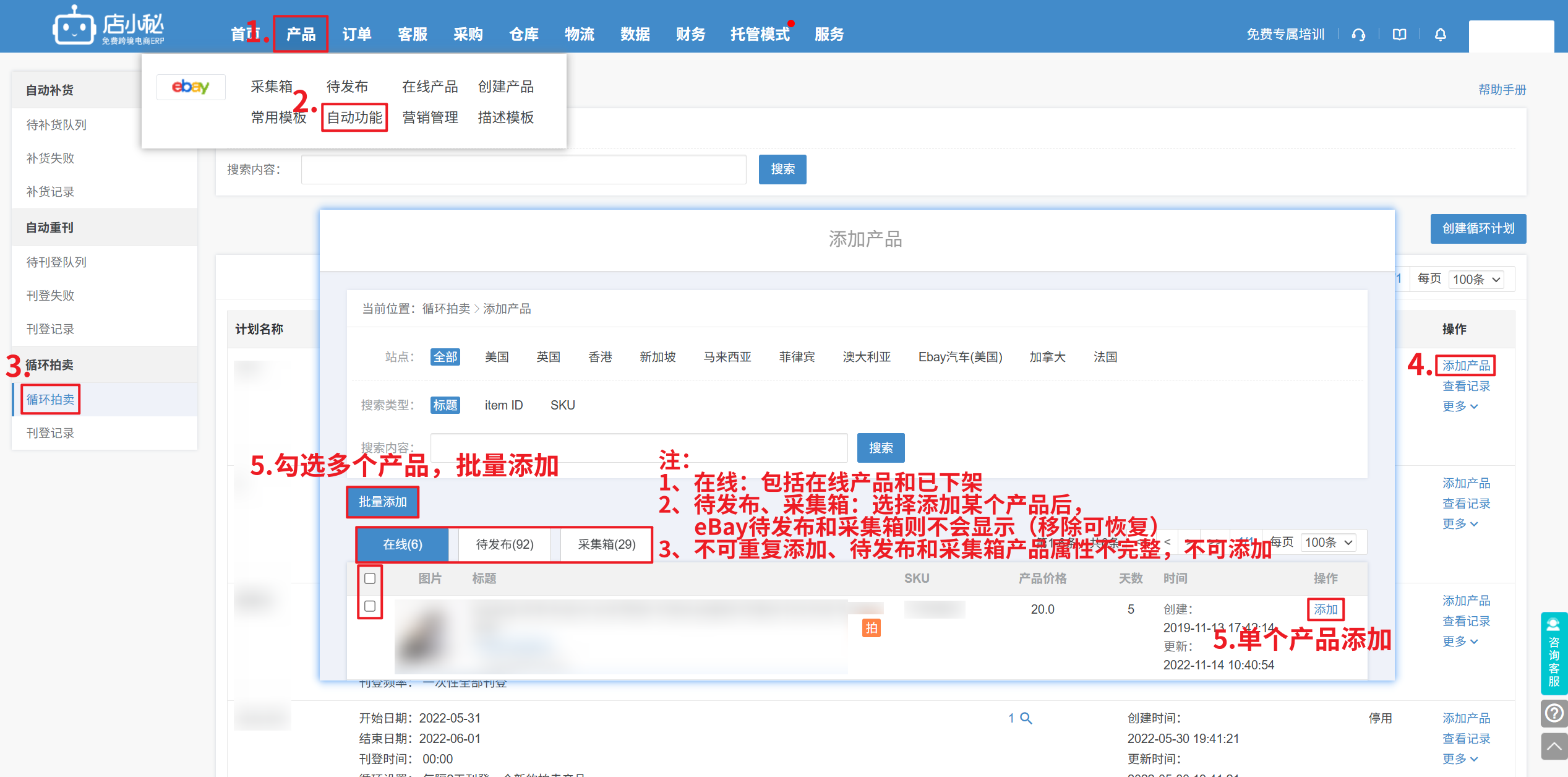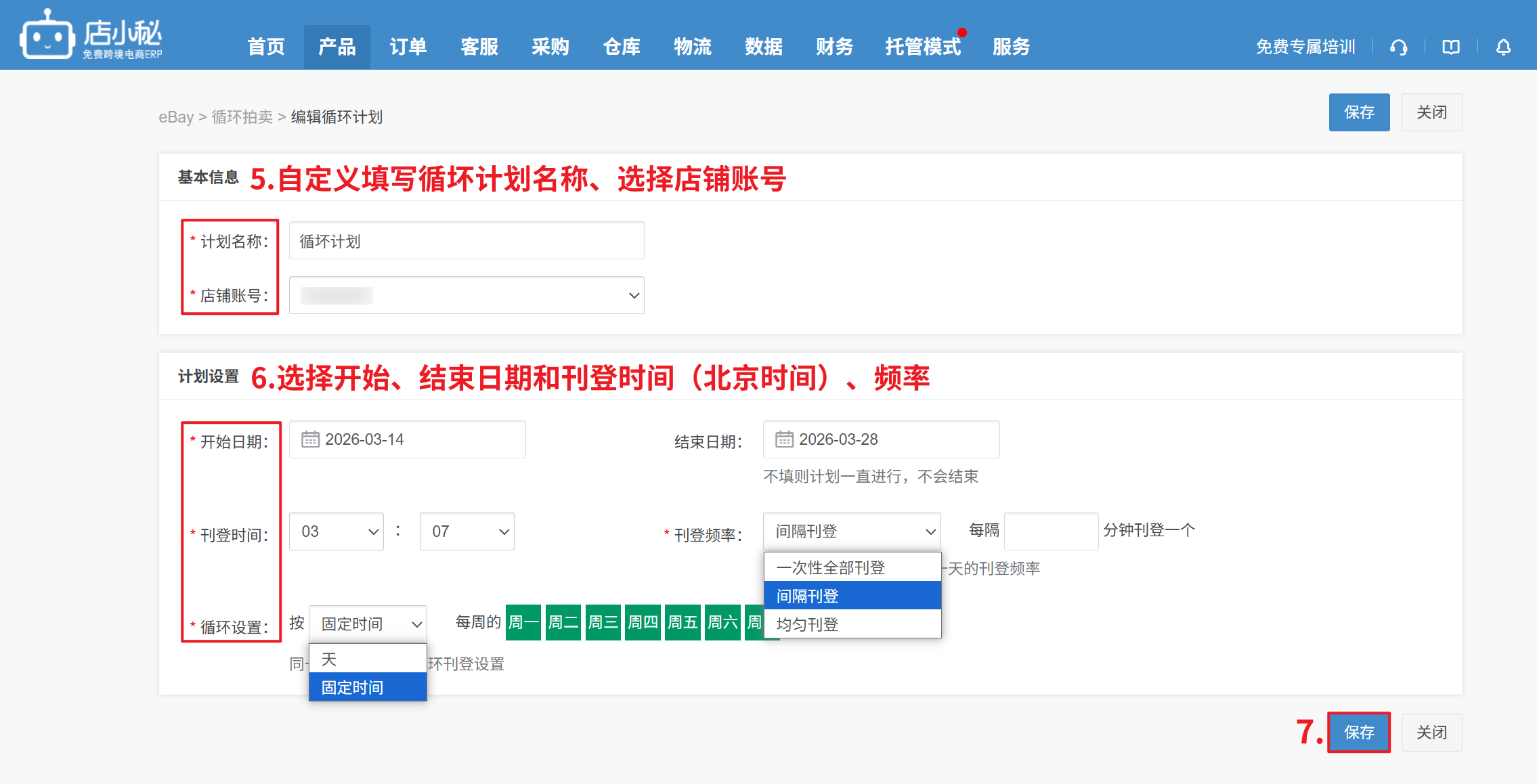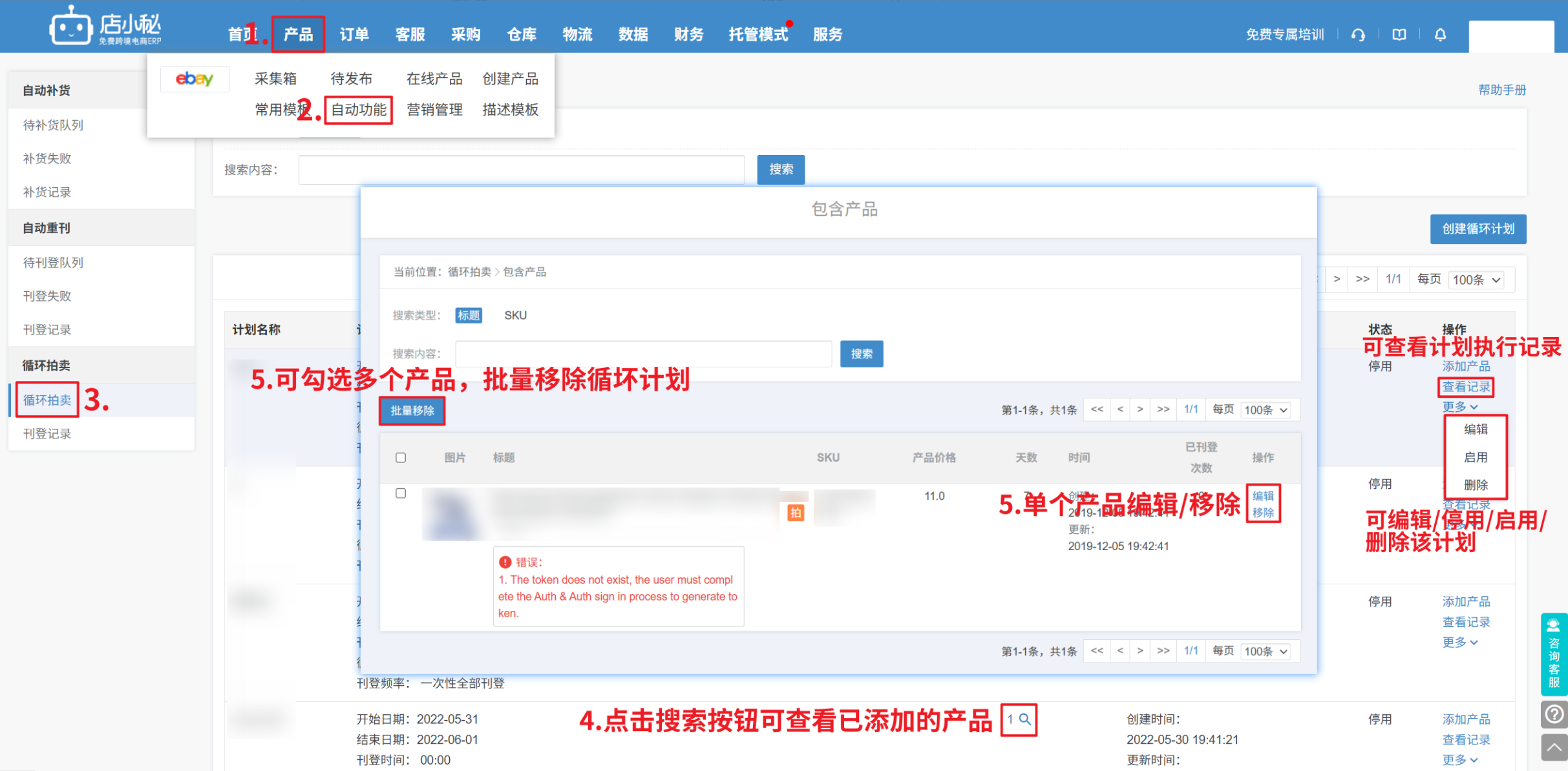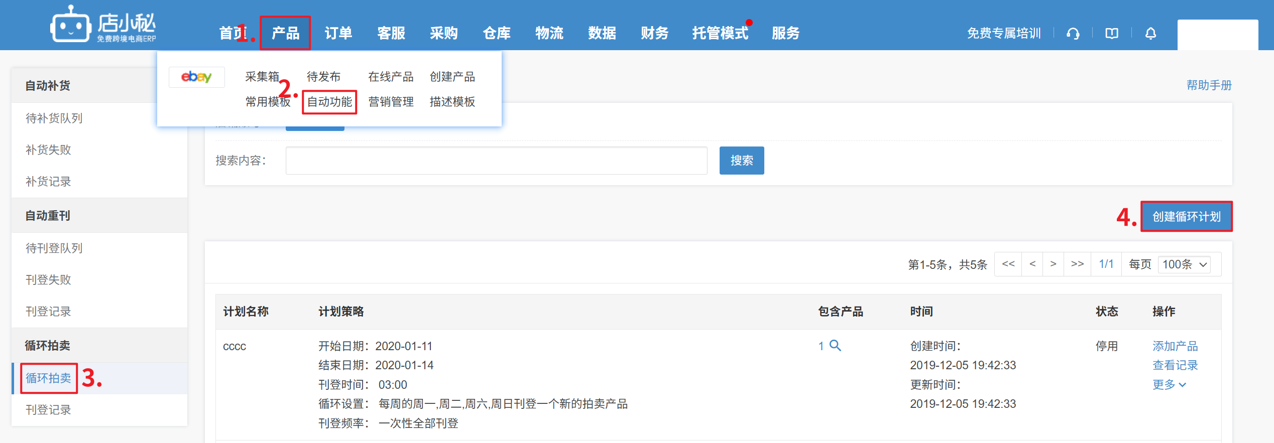 【产品—自动功能—循环拍卖—自定义计划名称—选择店铺—设置开始、结束日期—刊登时间、刊登频率循环设置—保存】