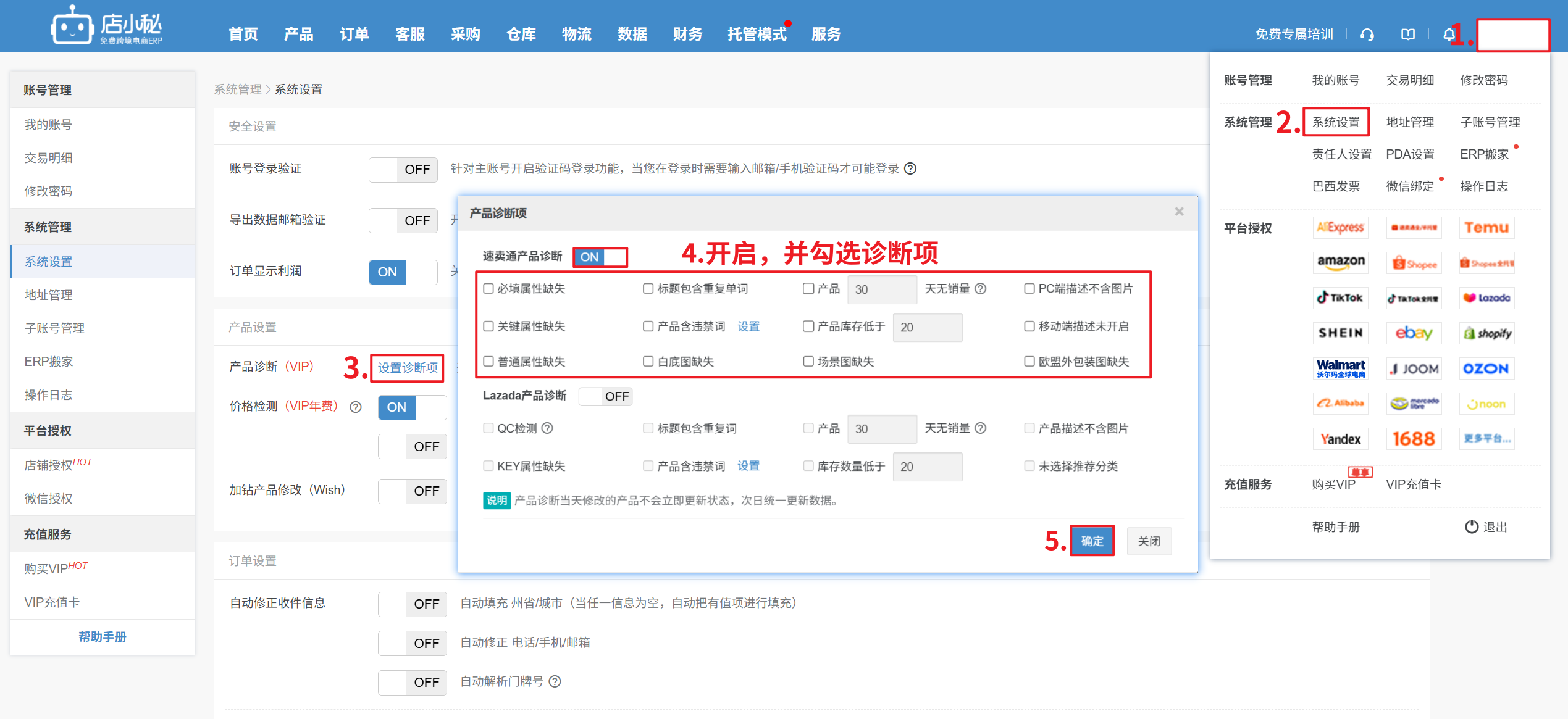 第一步:【主账号用户名—系统设置—产品诊断—设置诊断项—开启速卖通产品诊断—勾选诊断项—确定】