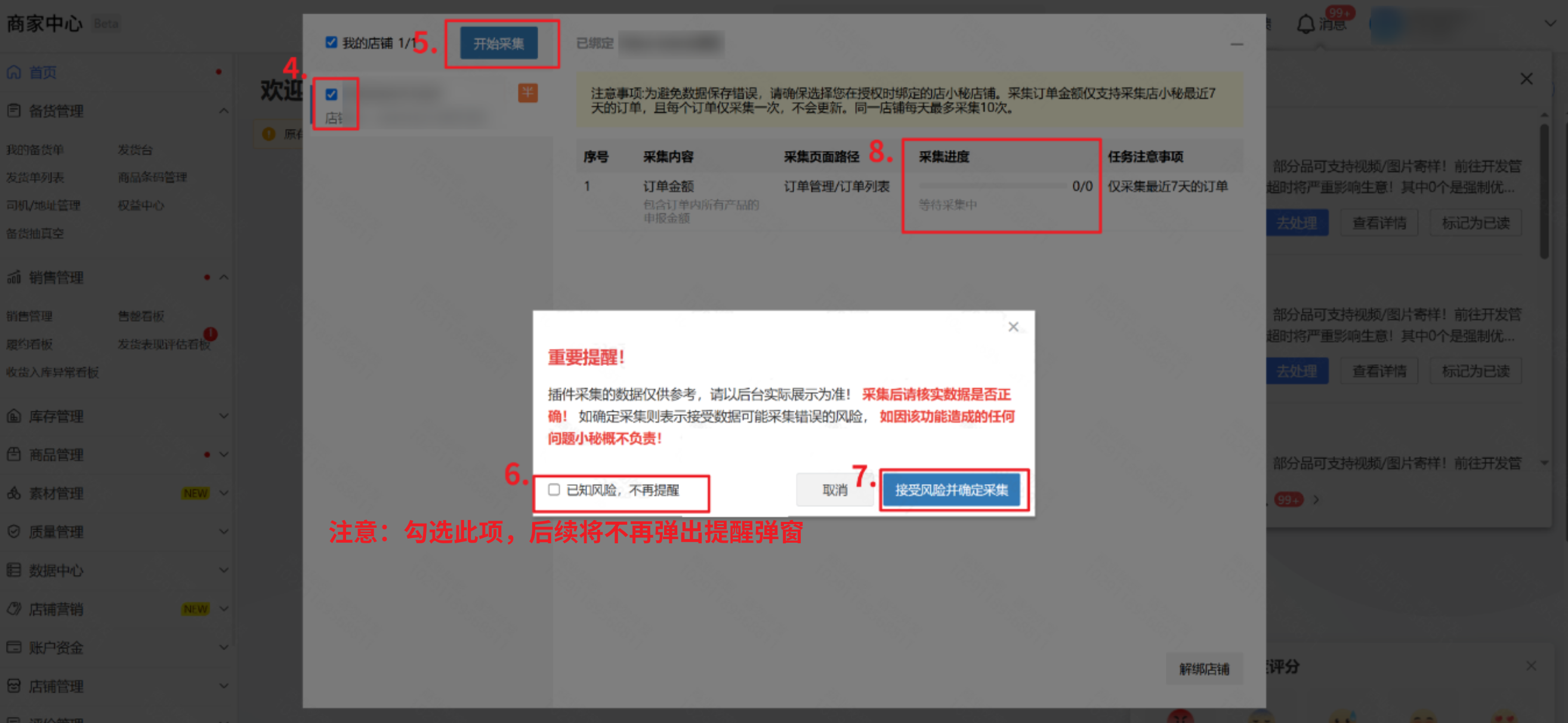注意:若勾选了“已知风险,不再提醒”,再点击采集,则不再弹窗,正常采集,每个平台的不再提醒都需要单独点击