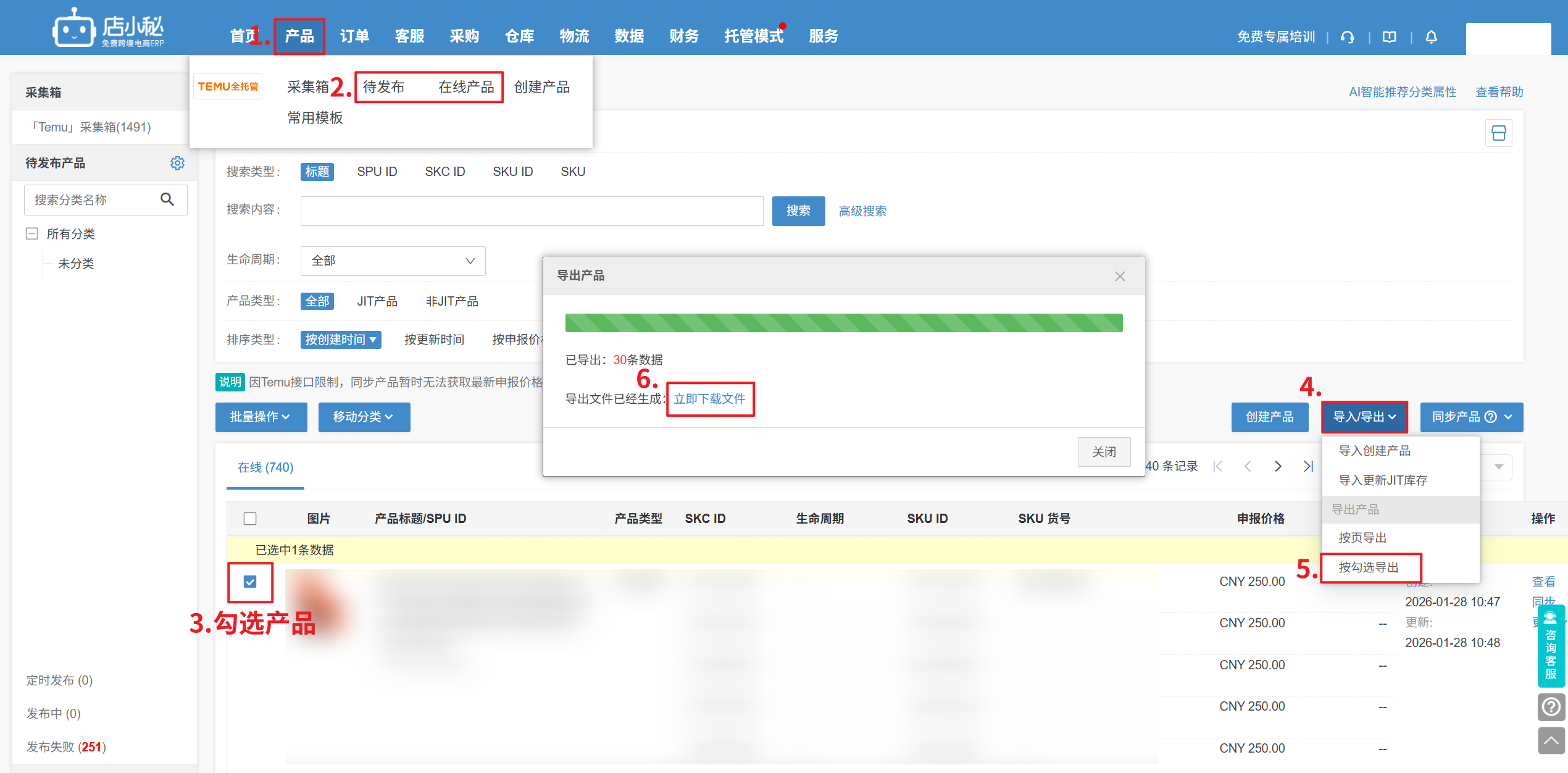 第一步:【产品—待发布/在线产品—勾选产品—导入/导出—按勾选项导出产品—点击立即下载文件】