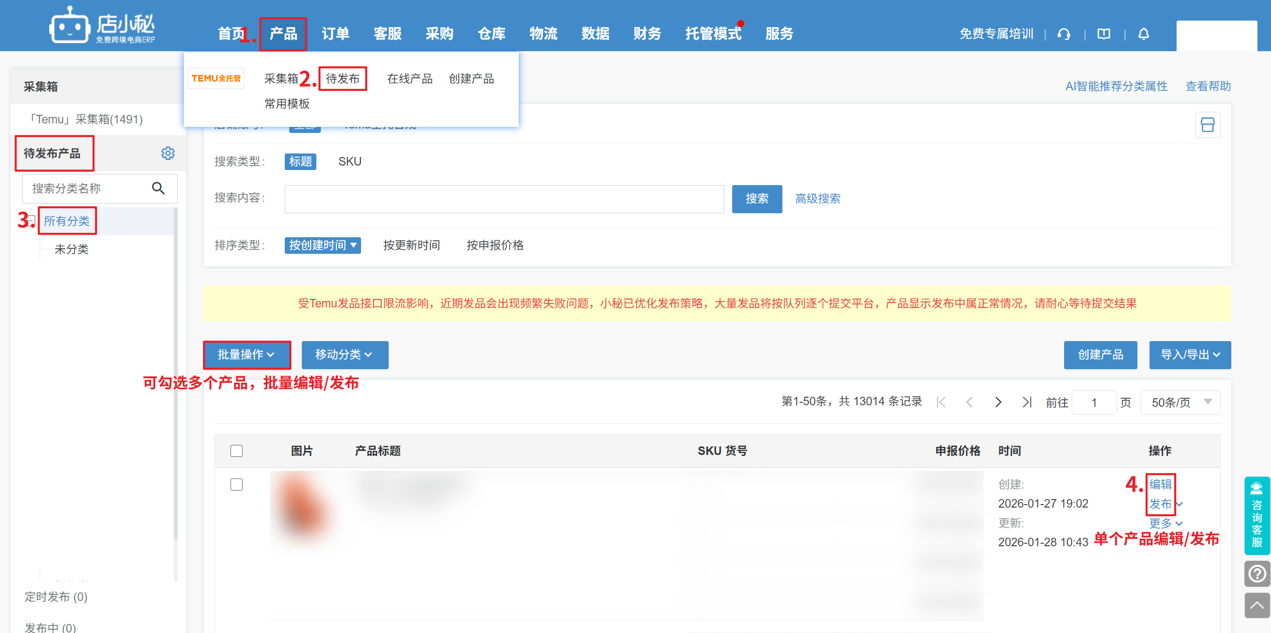 第二步:【导入成功后—产品—待发布—可以编辑更改信息—发布】