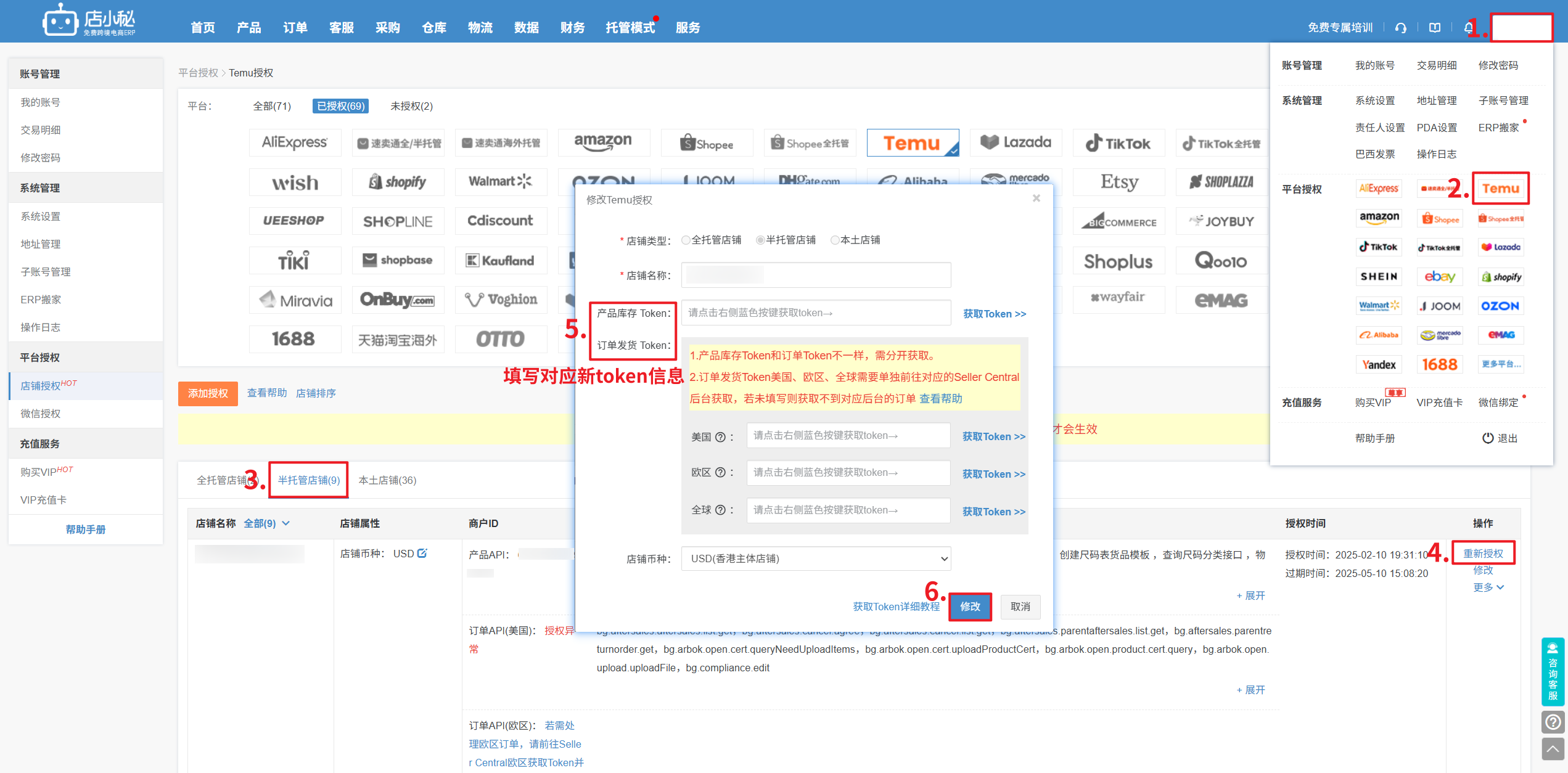 第二步:【再点击获取授权—选择店小秘ERP—常规授权和特殊授权权限都必须要全选—确认—复制access_token】
