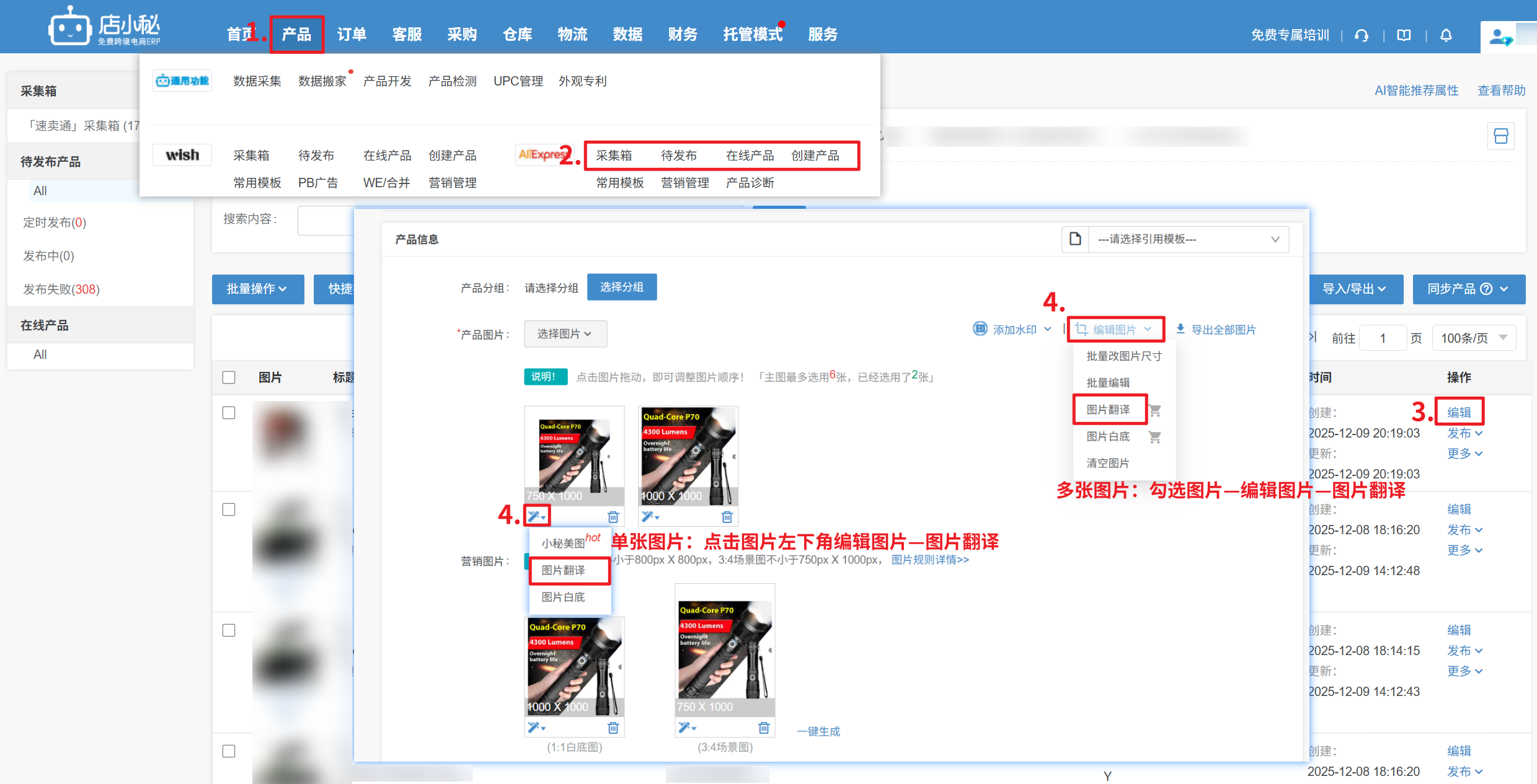 批量:【产品—采集箱/待发布/在线产品/创建产品—勾选图片—编辑图片—图片翻译】