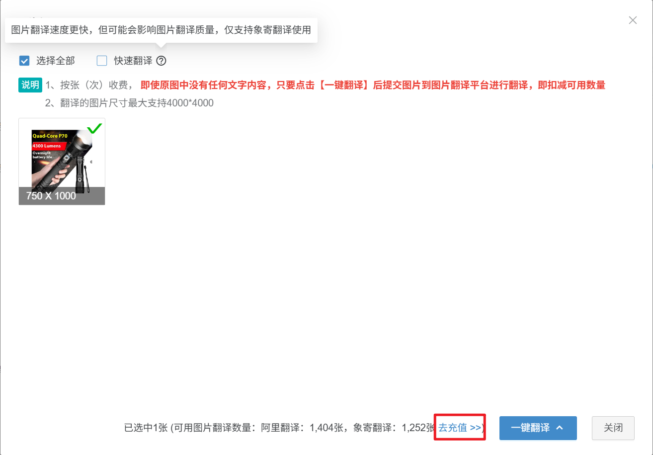 第二步:图片翻译需要购买才能使用,若还有剩余张数,即可正常使用;