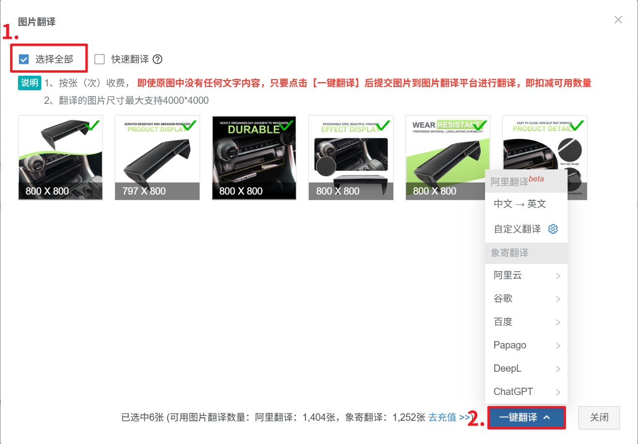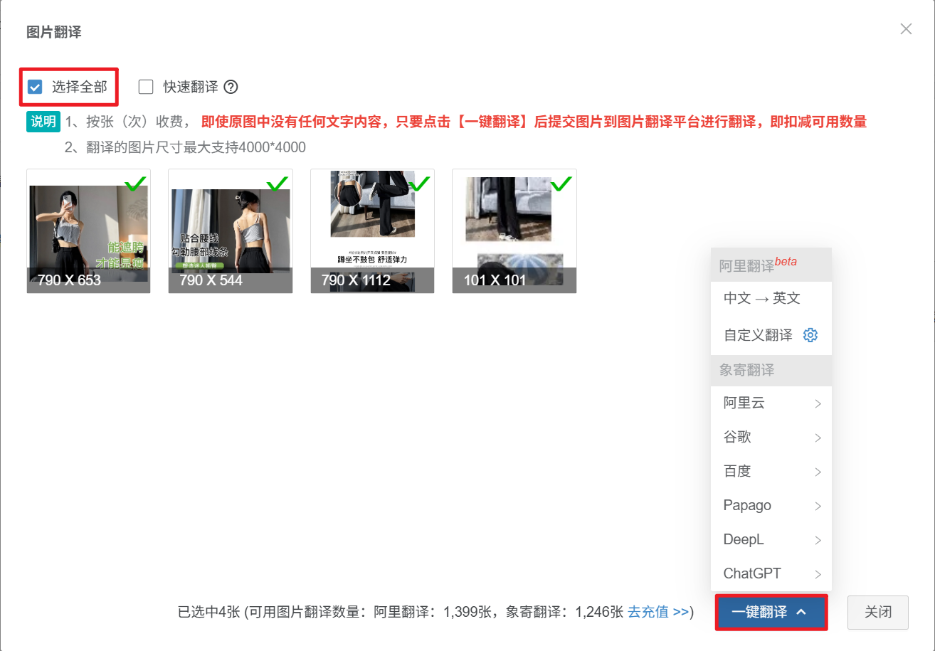 第三步:【点击勾选全部—一键翻译—选择阿里翻译/象寄翻译—确认—产品页面即展示翻译后的图片】