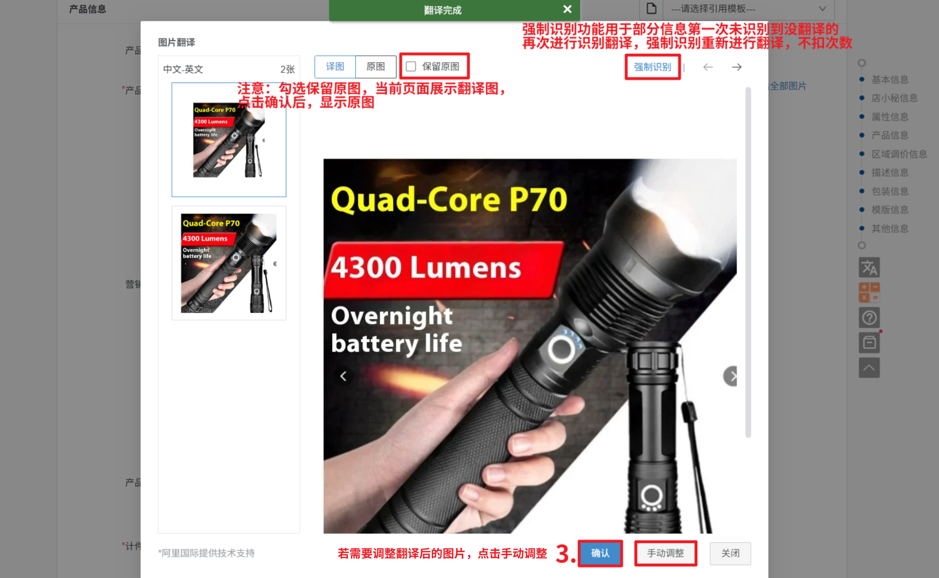 第四步:如需调整翻译后的图片,可点击手动调整,调整内容后,点击保存,产品页面即展示手动调整后的内容