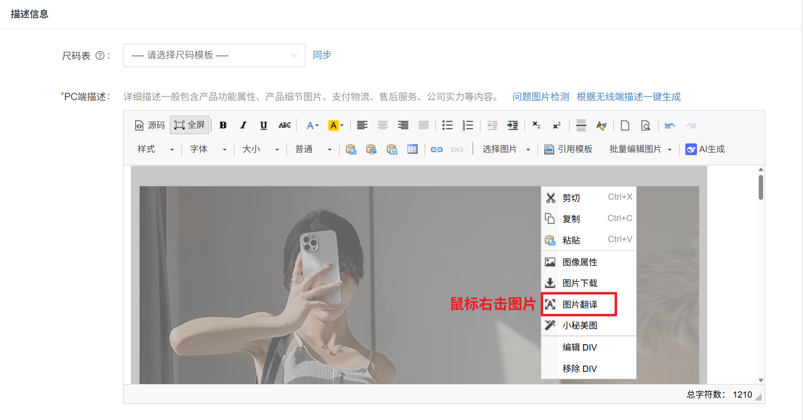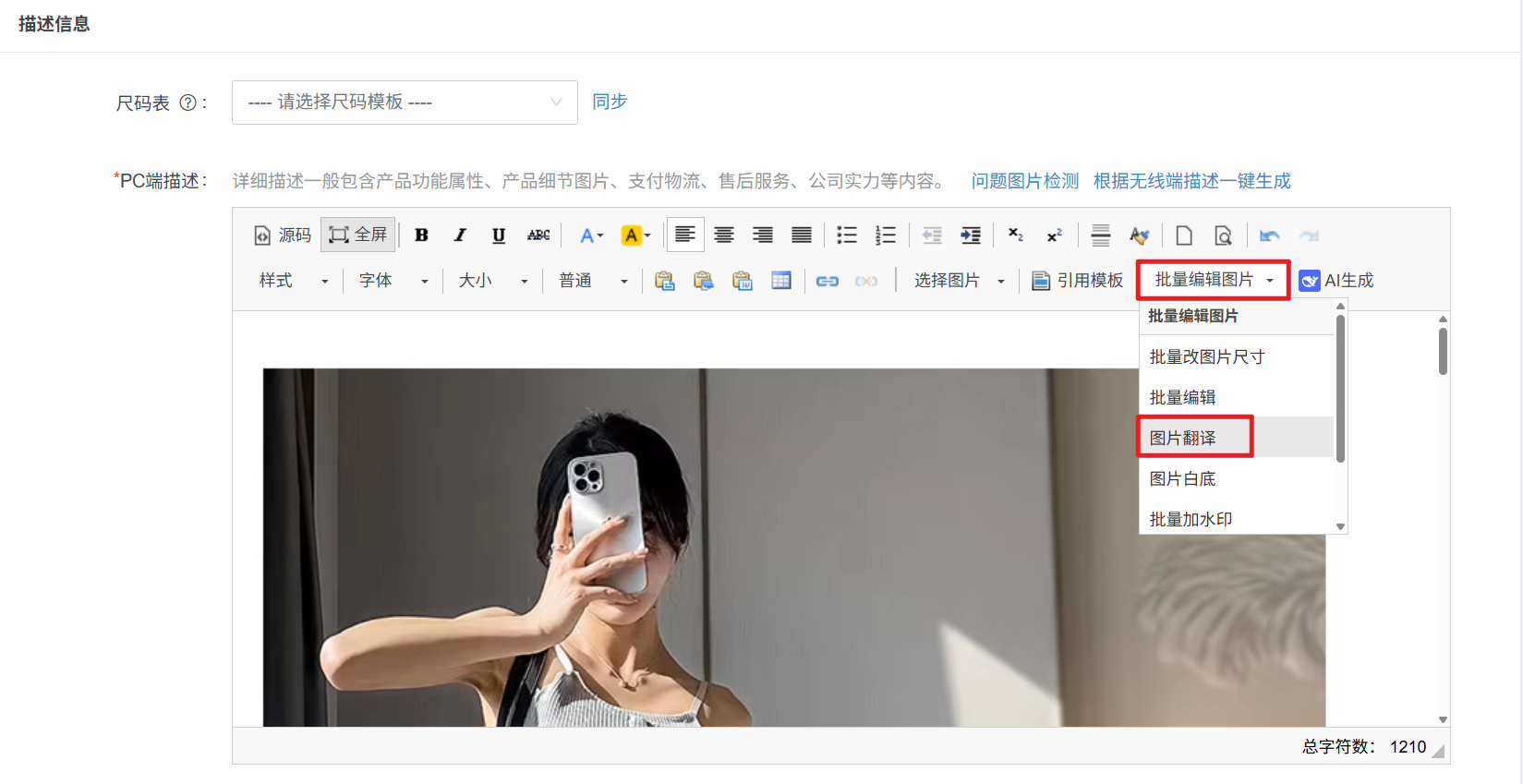 批量:【产品描述—点击批量图片翻译—勾选图片—一键翻译】