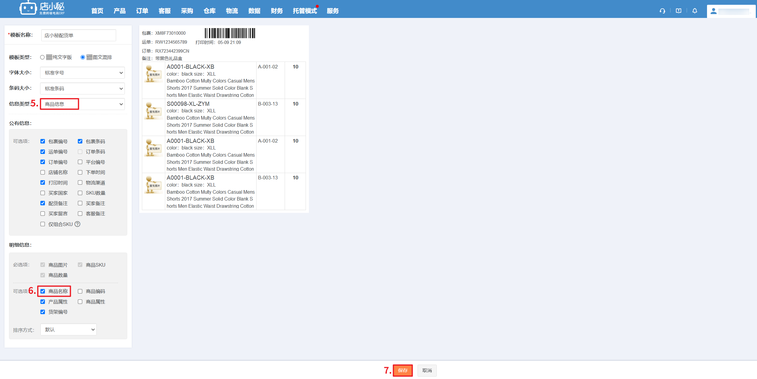 第二步:【用户名—系统设置—配货单/拣货单模板—设置显示内容为商品信息—勾选商品名称—保存】
