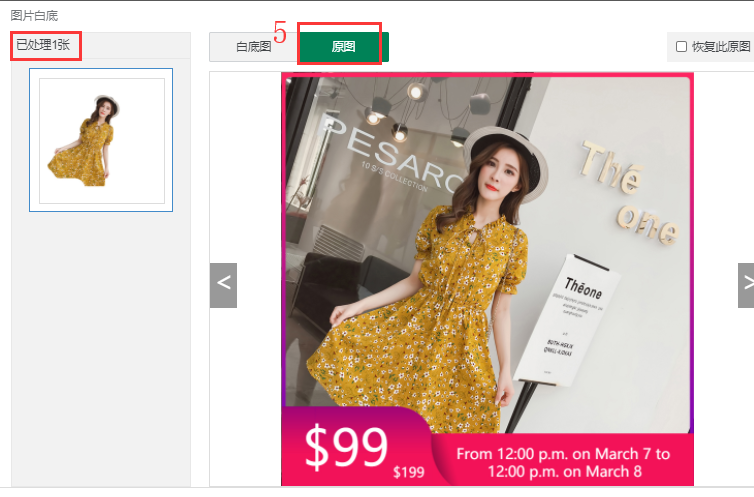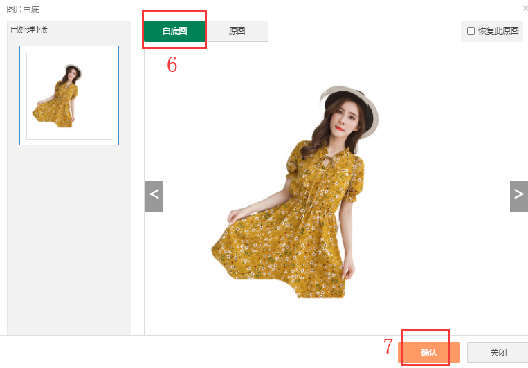 若勾选【恢复此原图】白底图会显示原图,点击确认,产品编辑页也会展示原图