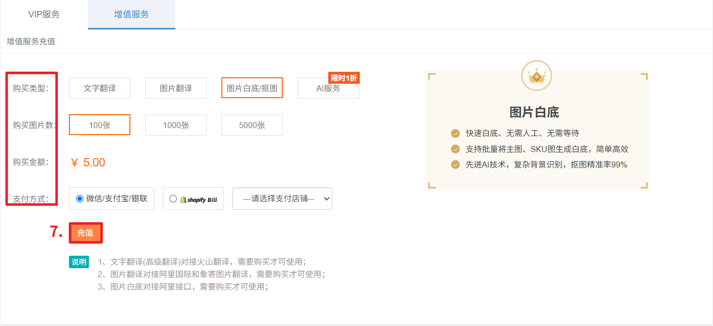 注意:点击【一键白底】时,会先扣除免费可用的数量,其次再扣除付费的数量!