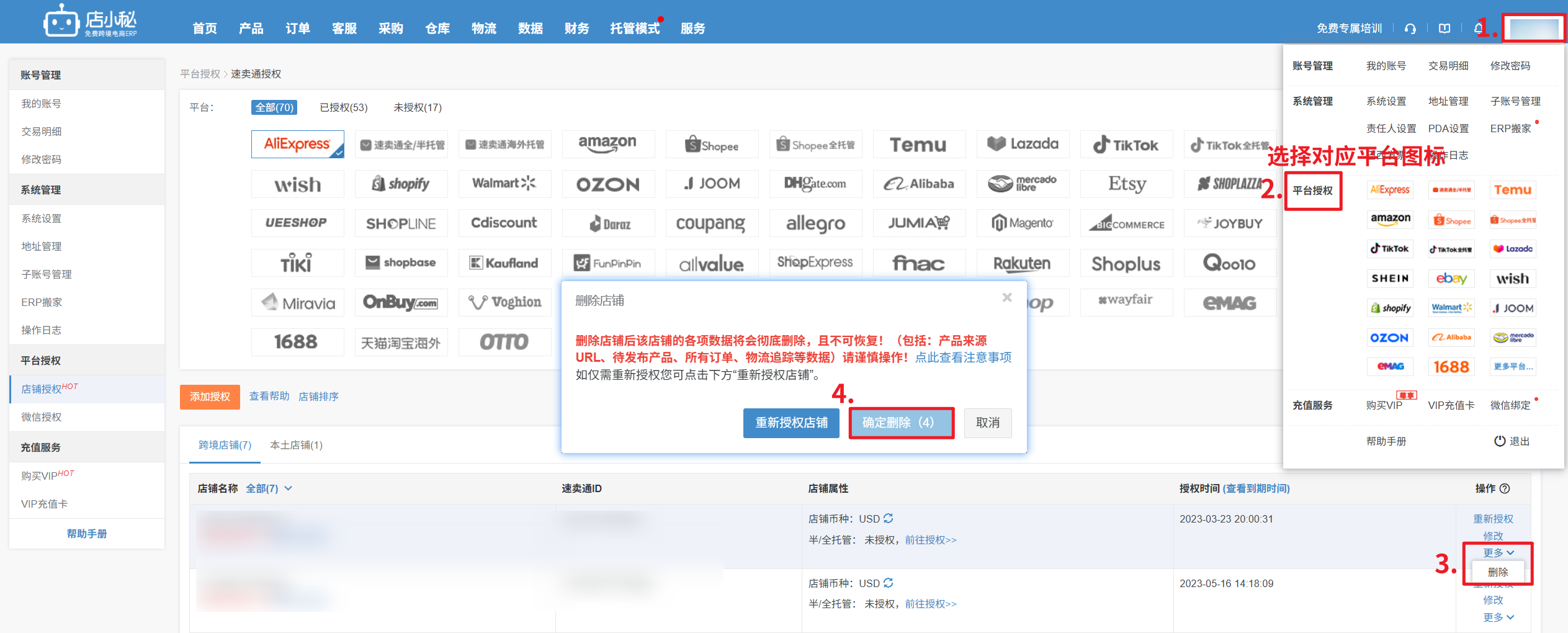 注意:删除店铺授权,订单、待发布产品、来源URL等信息会彻底删除,且无法恢复!!!