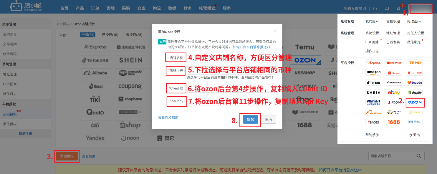 第二步:【登录小秘主账号—用户名—平台授权—点击Ozon—添加授权—自定义店铺名称—填写ID、Key信息—授权】