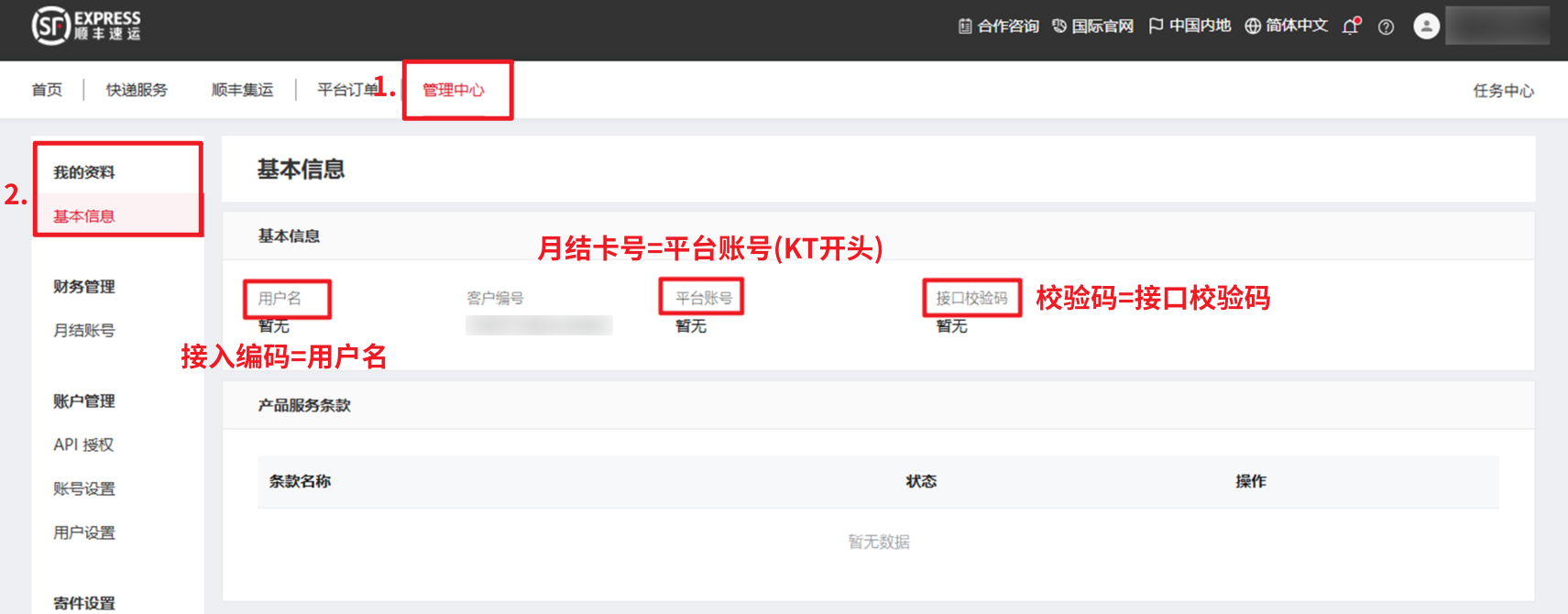 ② 接入编码/客户月结卡号/检验码:【到顺丰国际小包后台:管理中心—我的资料—基本信息—复制用户名/平台账号/接口校验码】